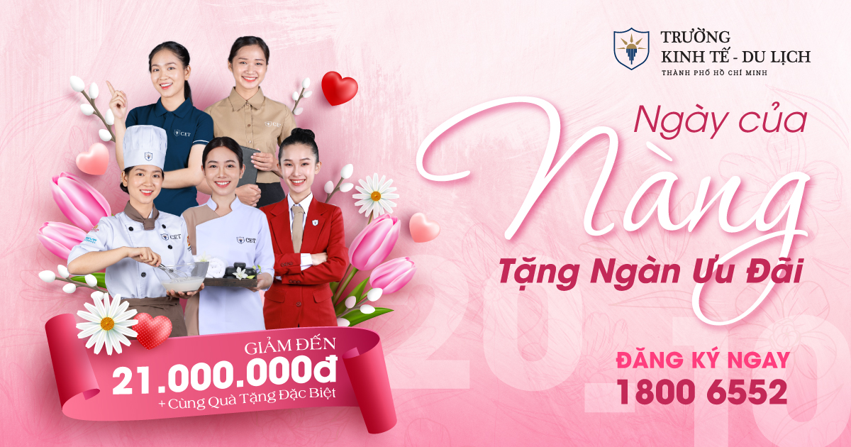 Từ ngày 15/10/2023 – 31/10/2023, trường Trung cấp Kinh tế – Du lịch TP. HCM (CET) và Hướng Nghiệp Á Âu (HNAAu) triển khai chương trình khuyến mãi mang tên “Ngày của nàng – Tặng ngàn ưu đãi”. Các bạn nữ hãy nhanh tay đăng ký tham gia các chương trình học để có thể lĩnh hội kiến thức mới với mức học phí hấp dẫn nhé.