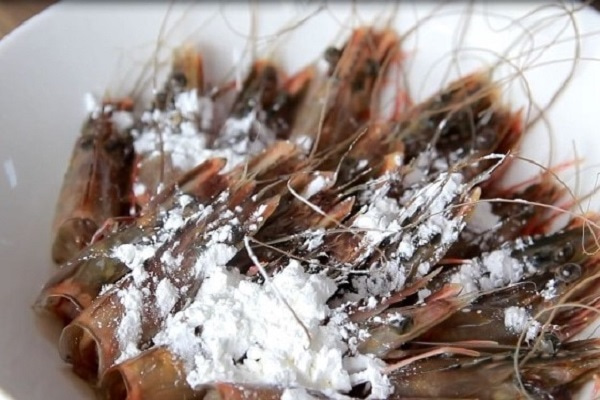 Sau đó, bạn cắt phần đầu tôm ra để riêng, (đừng quên làm sạch phần đầu tôm lúc sơ chế) đảo đều cùng 20gram bột bắp, đợi mang đi chiên giòn.